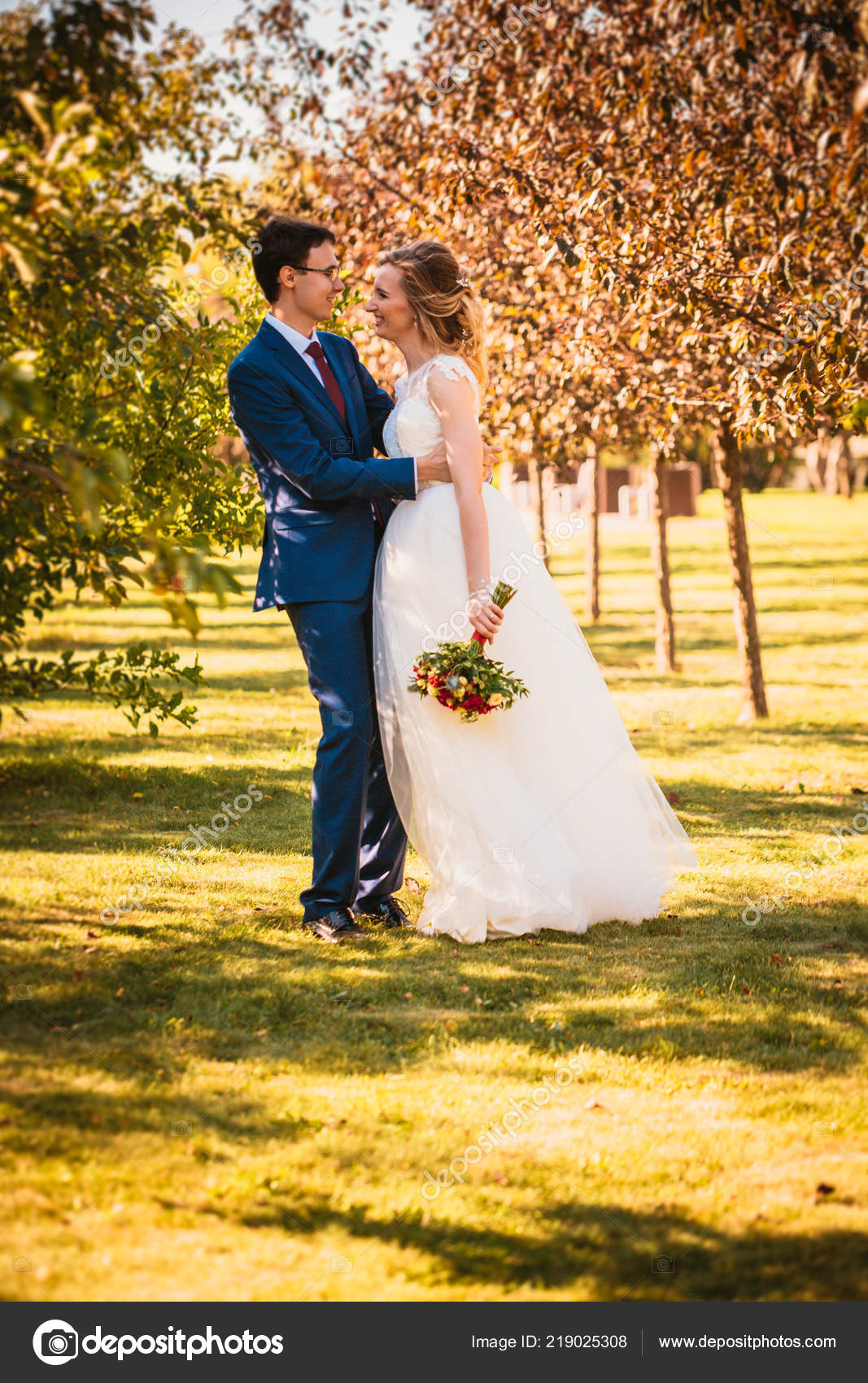 Beautiful Stylish Bride Groom Garden Background Stock Photo