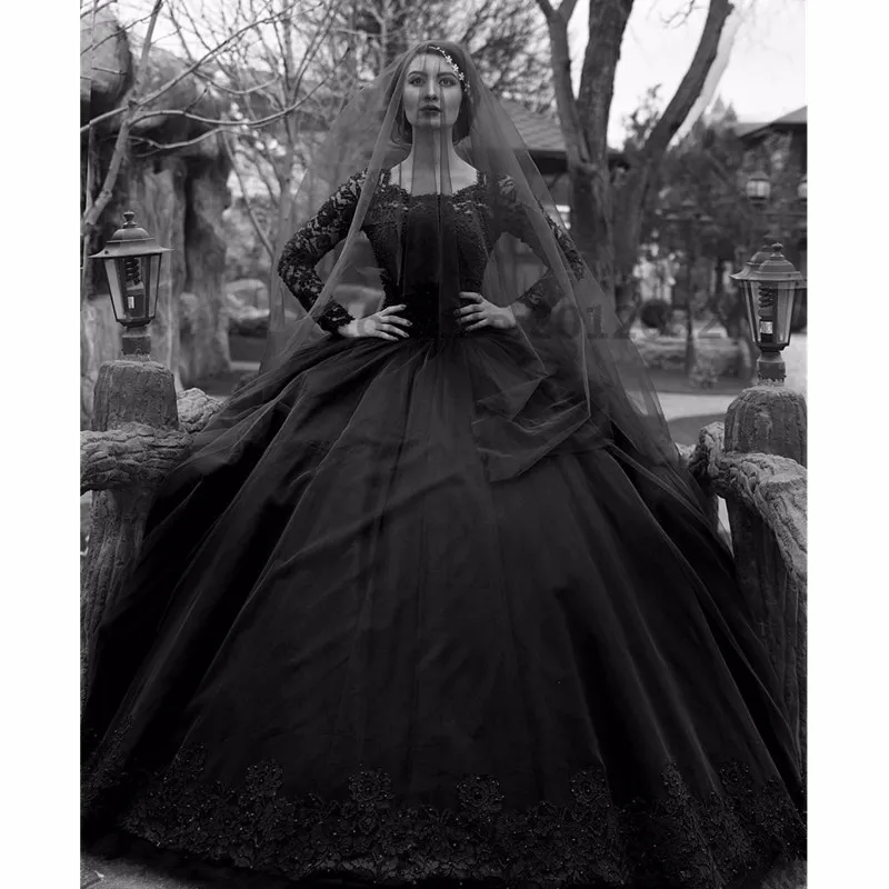 Vintage Black Gothic Wedding Dresses 2019 Long Sleeves Beads Lace