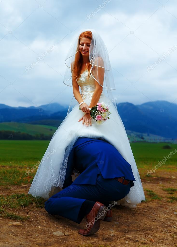 Groom Peeking Under His Bride Dress Funny Wedding Concept