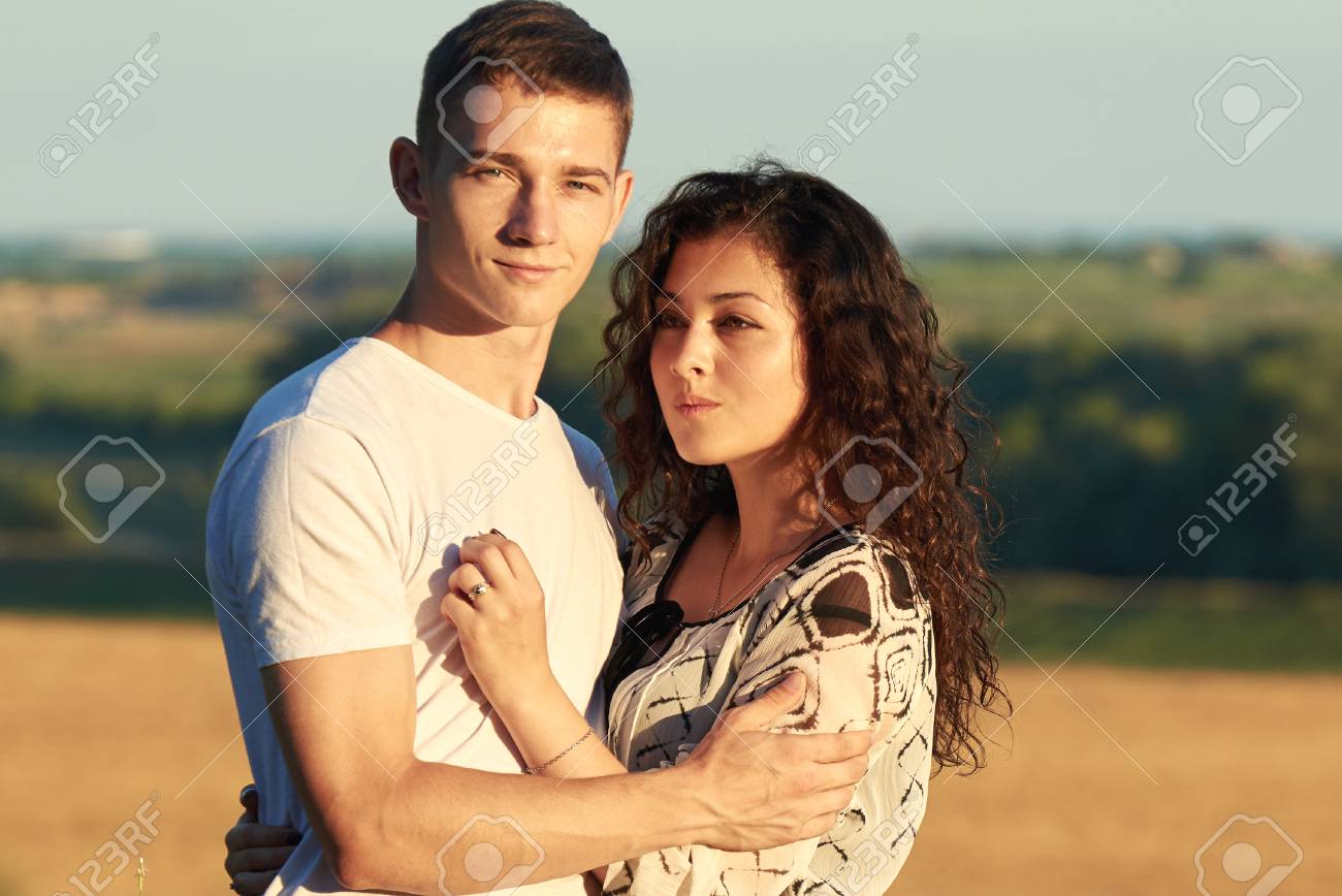 Happy Young Couple Posing High On Country Outdoor Romantic People