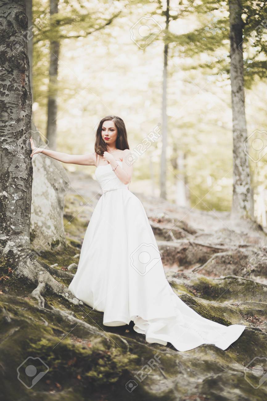 Beautiful Happy Bride Outdoors In A Forest With Rocks Wedding