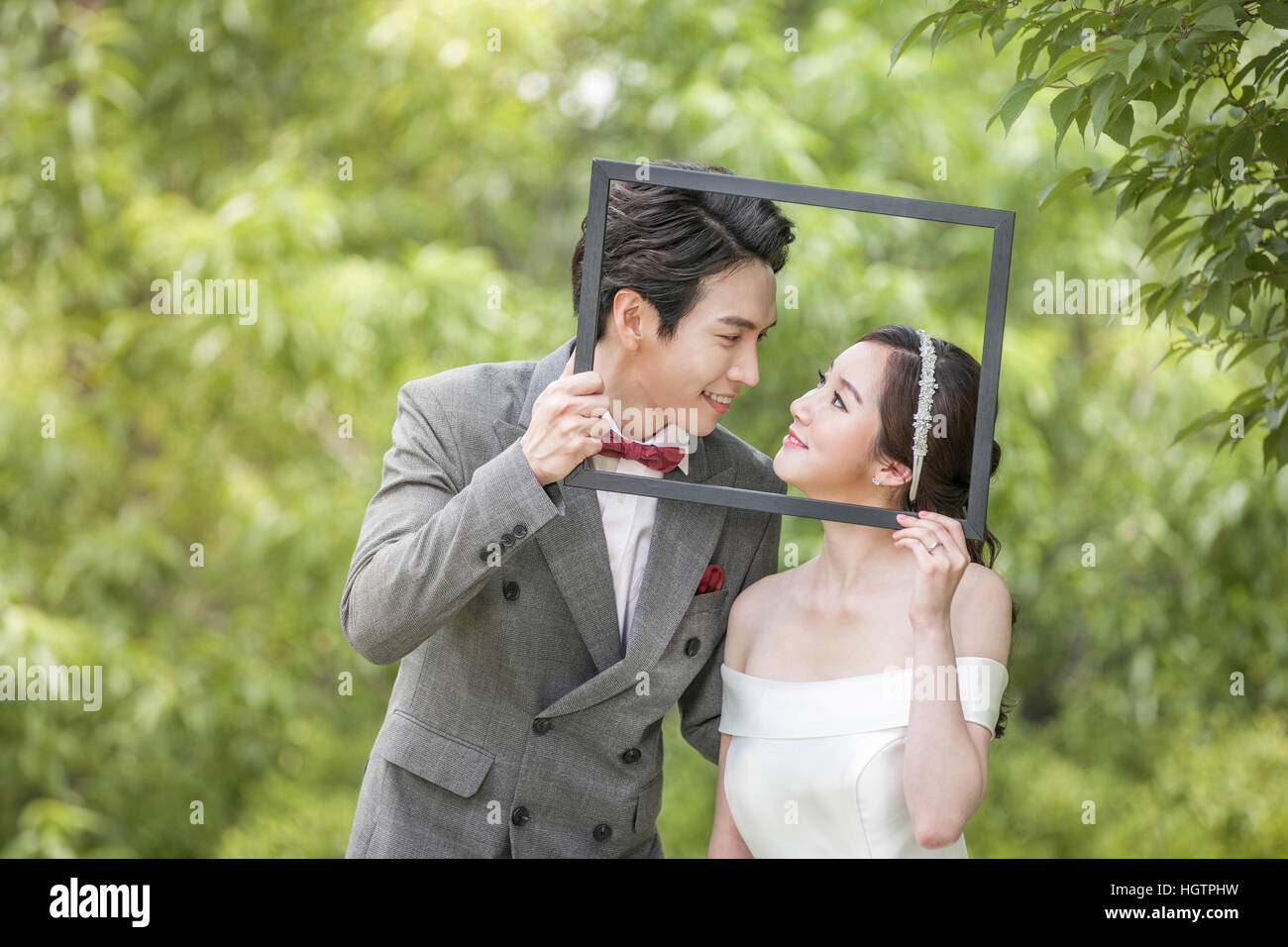 Portrait Of Young Wedding Couple With Frame Posing Outdoors Stock