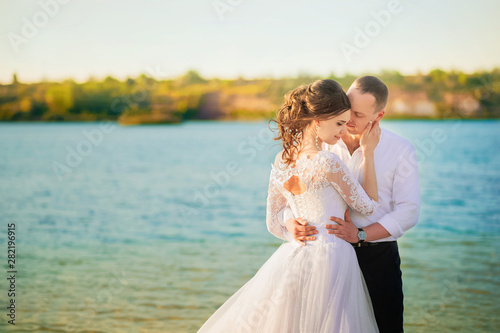 Romantic Wedding Couple On The Shore Bride With The Groom In The