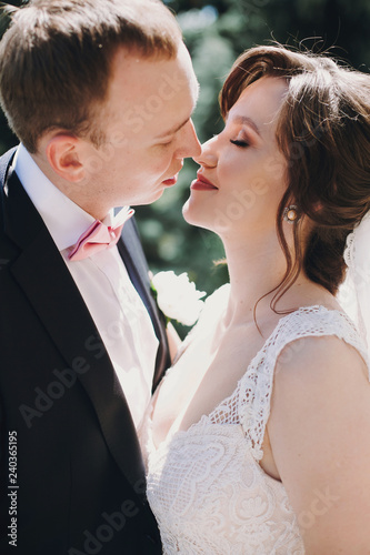 Young Wedding Couple Enjoying Romantic Moments Outdoors Close Up